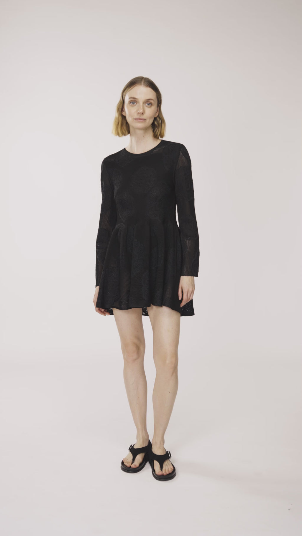 A feminine blouse crafted in delicate textured fabric with subtle sheer details. Designed with long sleeves, a fitted bodice, and a softly flared skirt, it creates a flattering and playful silhouette. A versatile black piece perfect for both day and evening occasions.