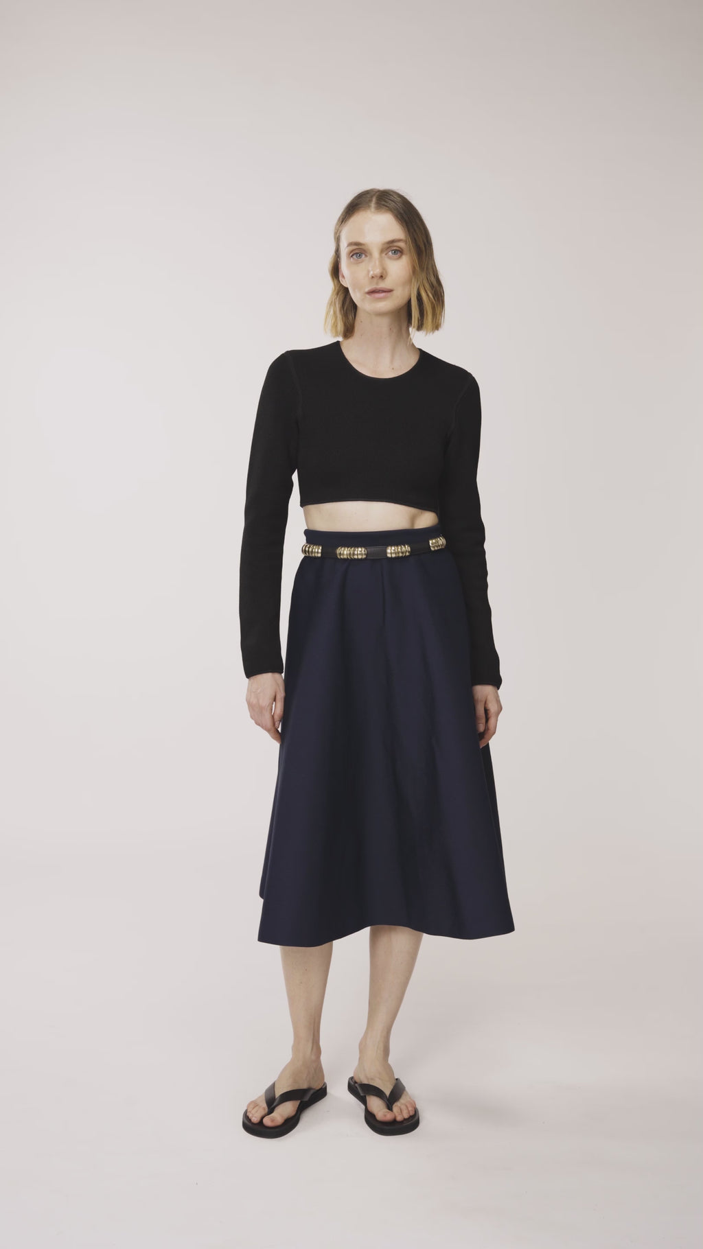 A timeless midi skirt crafted in structured knit denim. Designed with a high waist and fluid A-line silhouette, it offers soft movement while maintaining a clean, polished shape. Effortlessly versatile, it pairs seamlessly with both fitted tops and relaxed knits for elevated everyday wear.